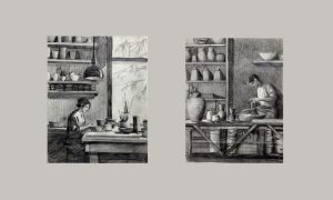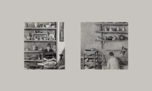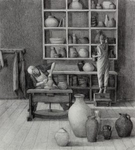 За работой в гончарной мастерской, 2021, карандаш, бумага, 50х30 см