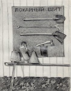 Пожарный щит, 2021, карандаш, бумага, 12х17 см