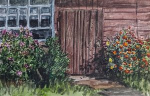 Цветочные клумбы у входа в дом, 2016, акварель, бумага, 20х14 см