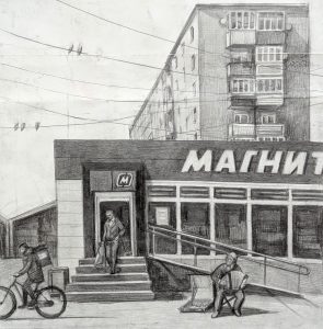 Деревенский магазин, 2021, карандаш, бумага, 55х49 см