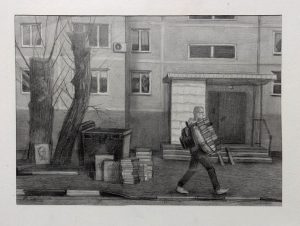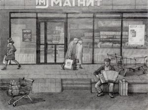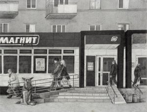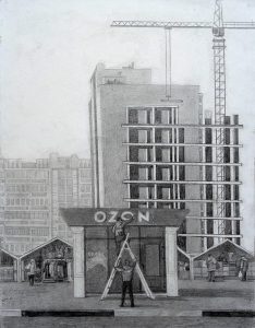 Переход на маркетплейсы, 2021, карандаш, бумага, 33х43 см. Участвовала в выставке «Черное и белое», НОГИНСКОЕ ОТДЕЛЕНИЕ ВСХР, 2024.